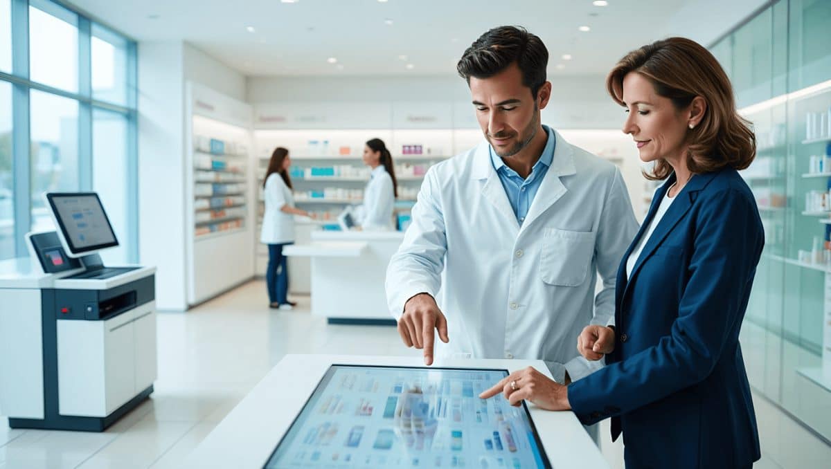 Integrierte Bildschirme sollen Pharmateams erlauben, Medikamente, Präparate und Services visuell zu erklären. Kunden sehen Produktinfos parallel zum Rat der Fachperson.